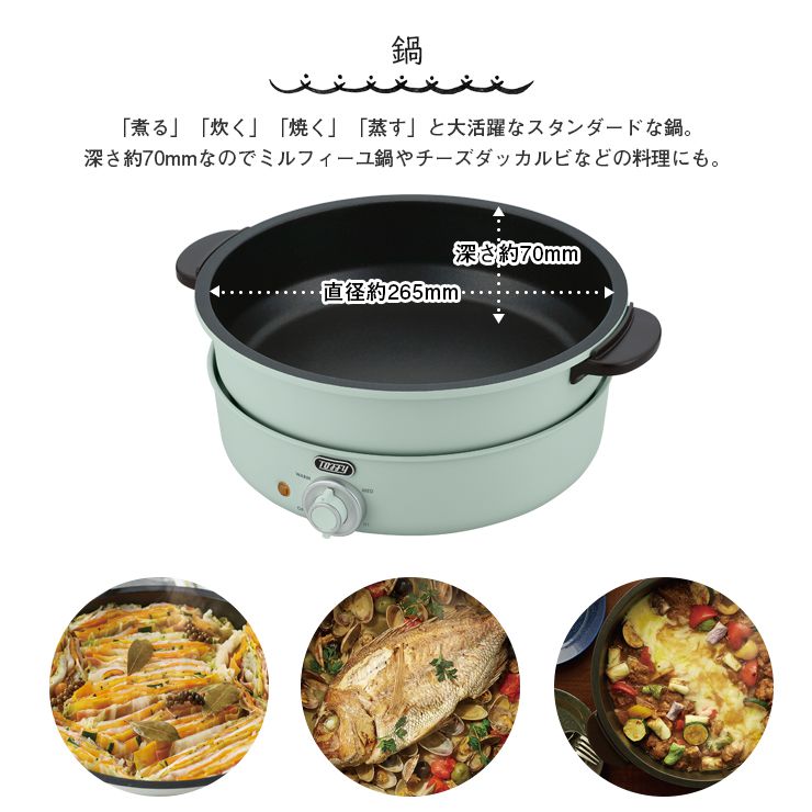 簡単・お手軽!卓上電気グリル鍋Toffy 電気グリル鍋「煮る」「炊く」「焼く」「蒸す」と1台でマルチに活躍する卓上の電気グリル鍋です。